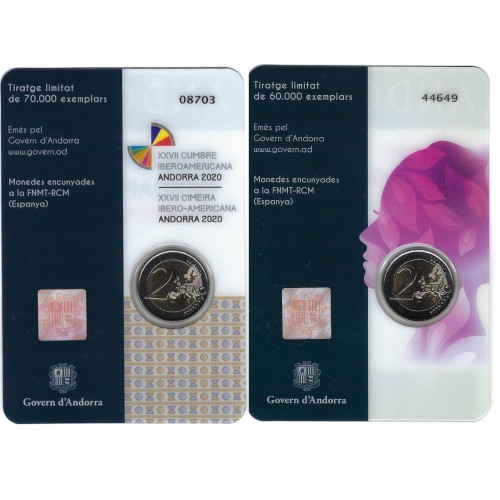 Andorra 2€ alusivas 50 anos Sufragio universal das mulheres Emissão: 60000 e XXVII Cimeira Iberoamericana Emissão: 70000